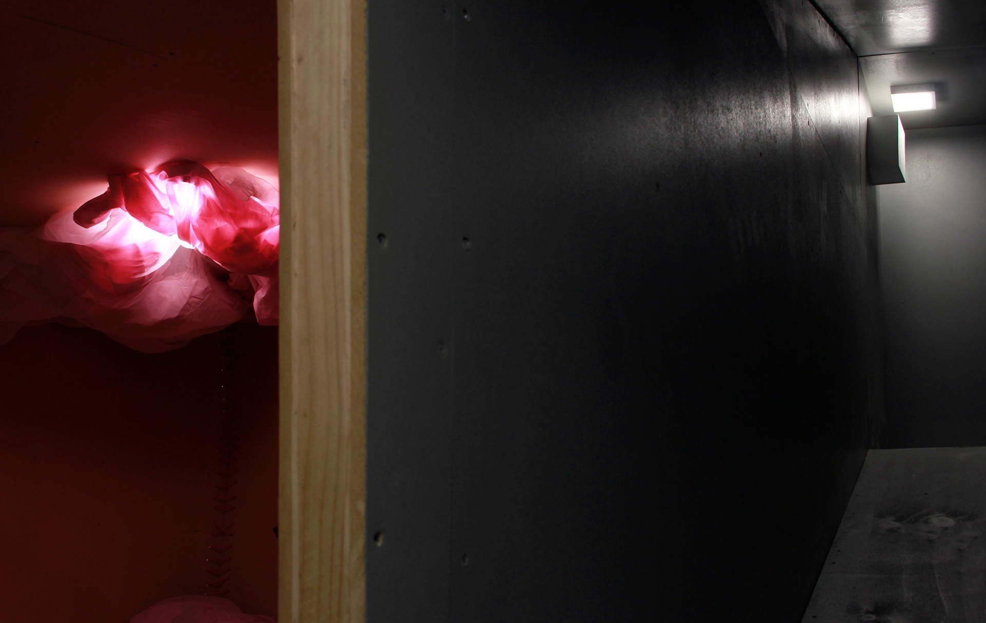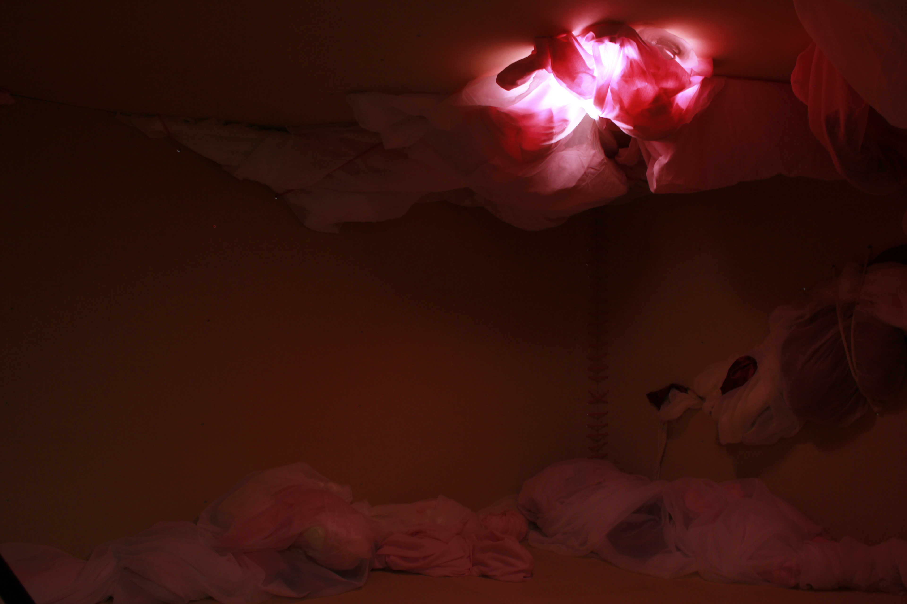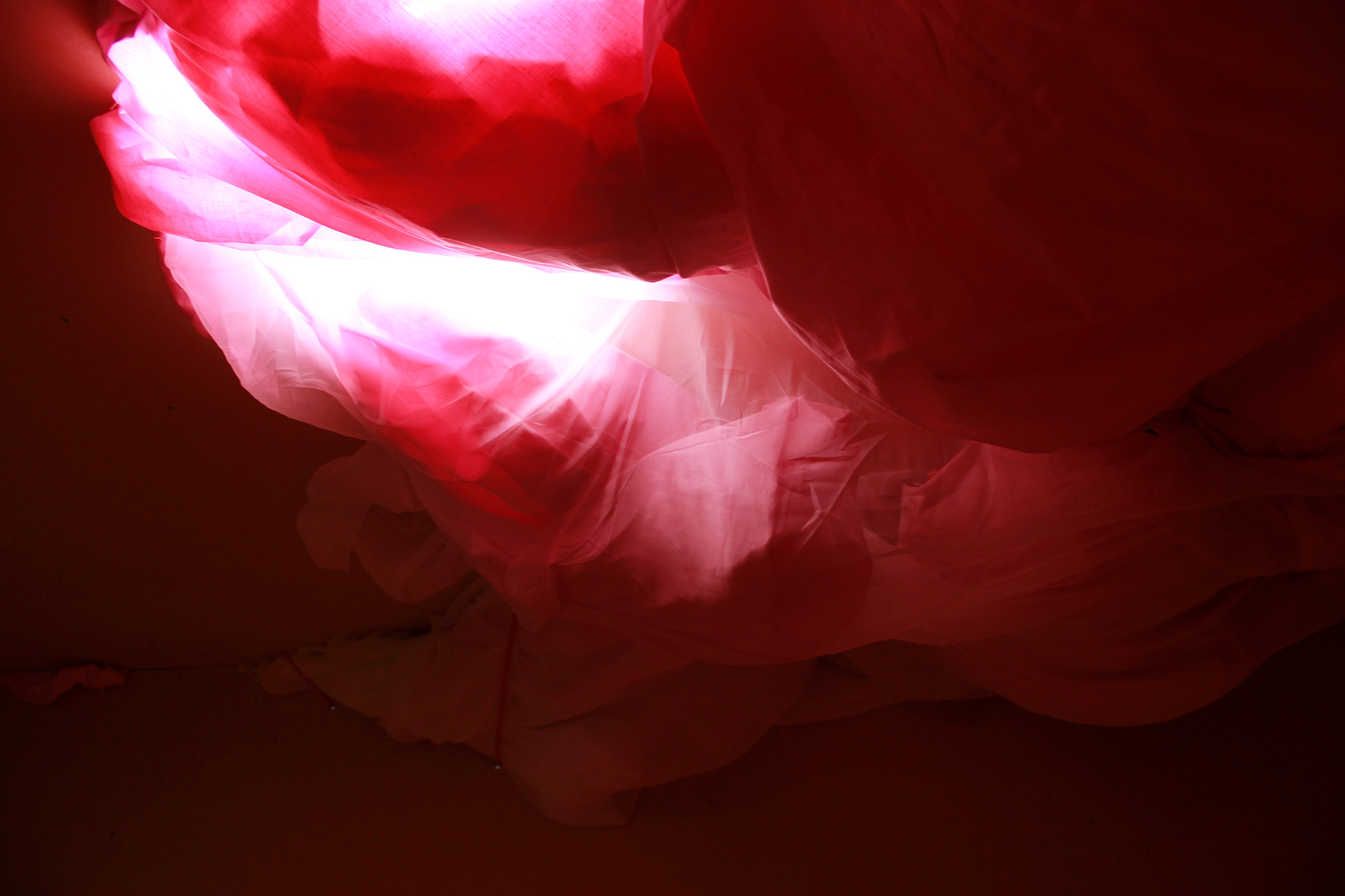 Wood, light, motor, fabric, rope. 390 x 370 x 400 cm, 2018.