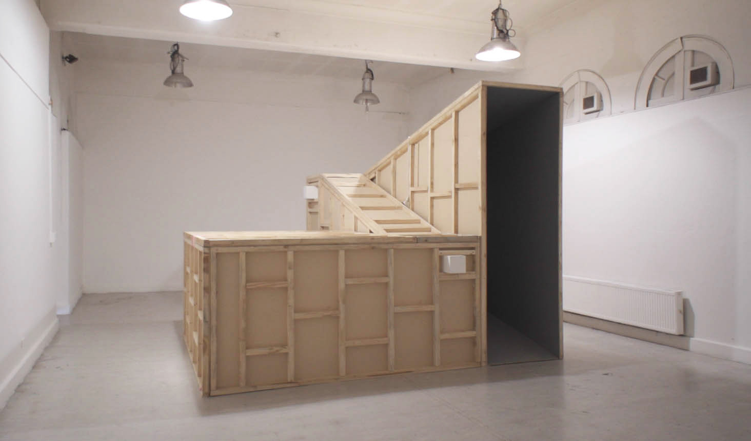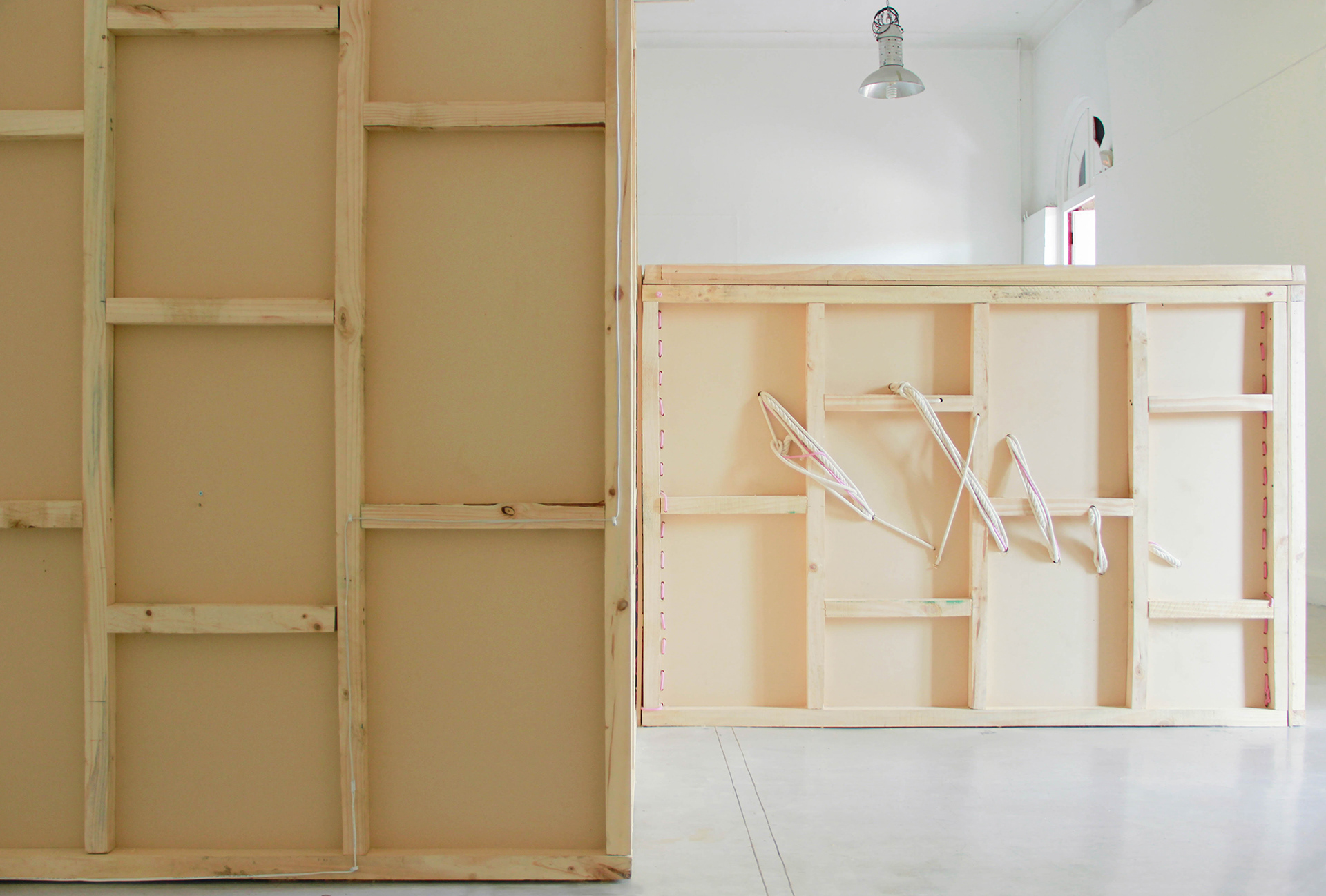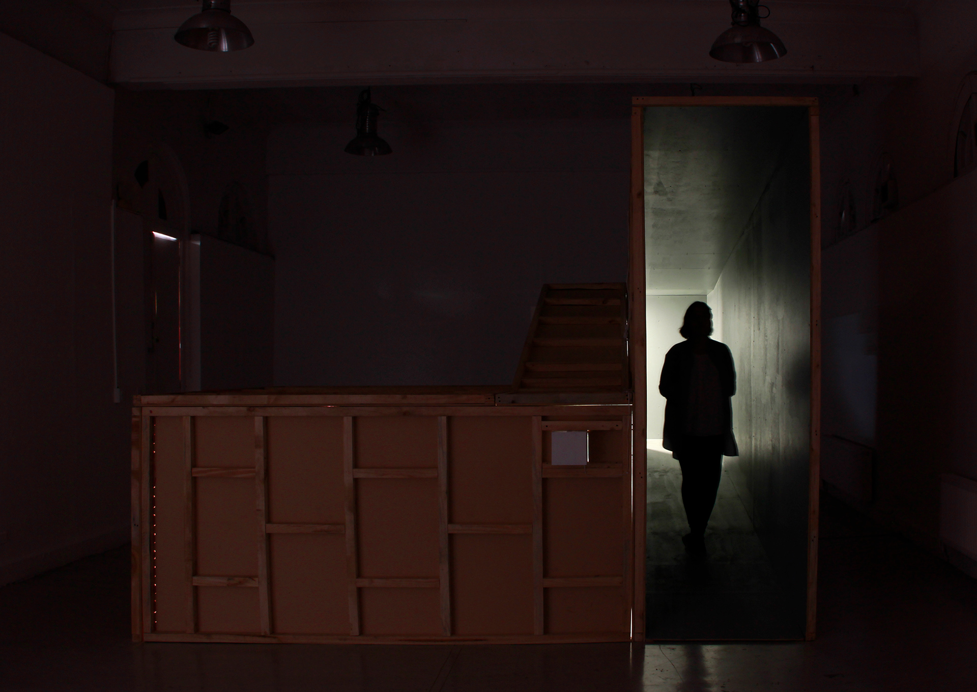 Wood, light, motor, fabric, rope. 390 x 370 x 400 cm, 2018.