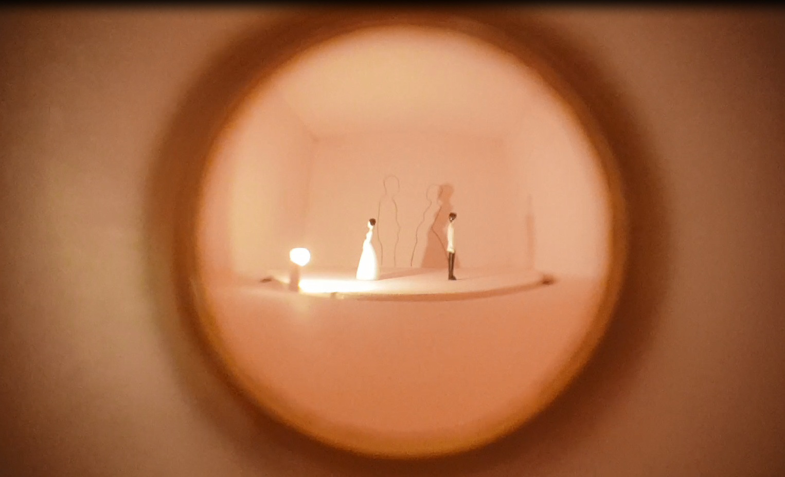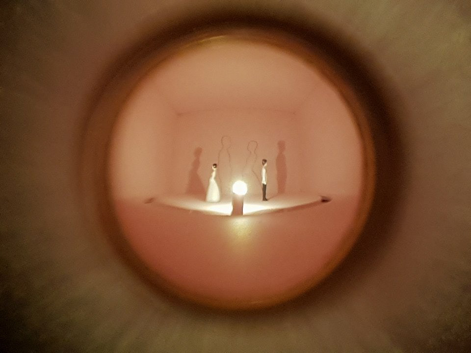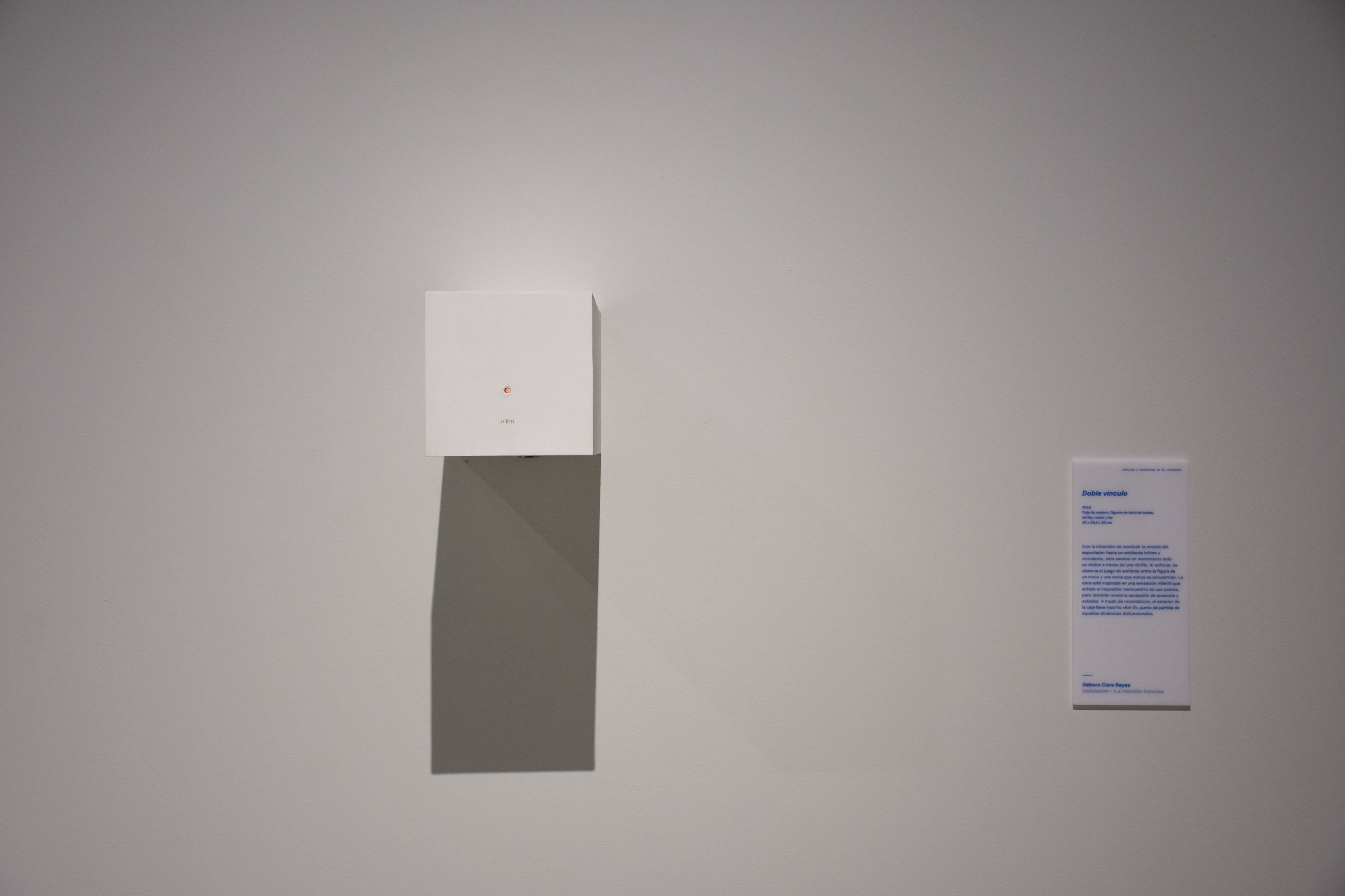 Wood box, wedding cake figurines, spyhole, engraved text, light, motor, 20 x 20,5 x 30 cm, 2018. Artwork exhibited at the 23th edition “Santiago Arte Joven”, Municipal young art Prize, Centro Cultural La Moneda, Santiago, Chile.