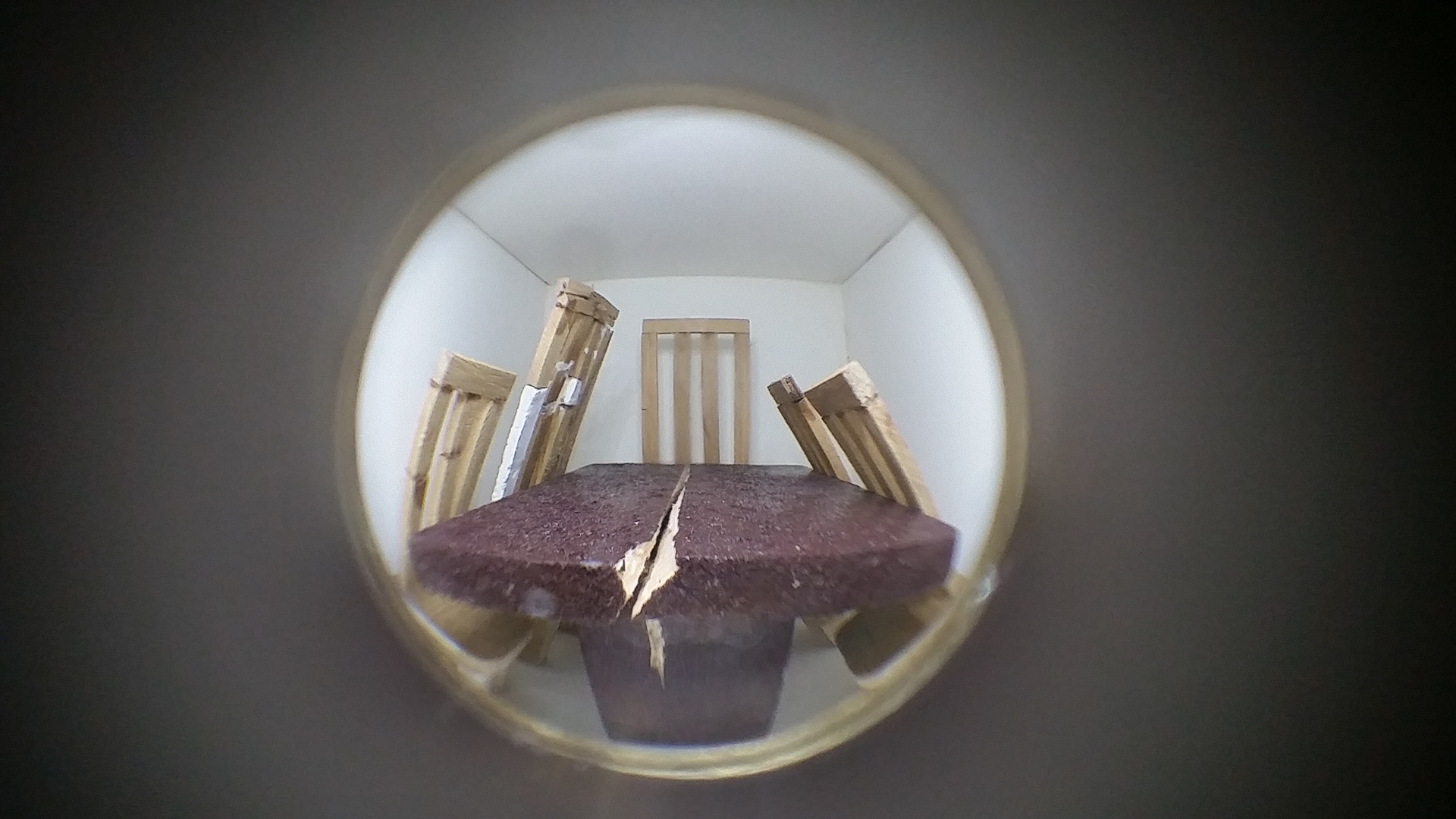 Wood box, balsa wood figures, spyhole, engraved text, light, 17 x 18 x 26, 5 cm, 2016. Artwork exhibited at the 11th edition “Arte Laguna Prize” finalists, Arsenale, Venice, Italy.